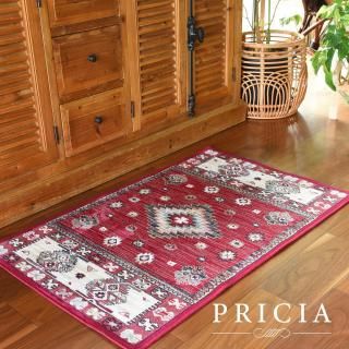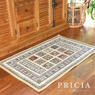 使いやすいペルシャ柄が特徴のモケット織ラグです。キリムでよく見られる幾何学模様をちりばめたデザインです。西海岸風のインテリアにも。