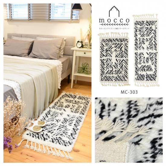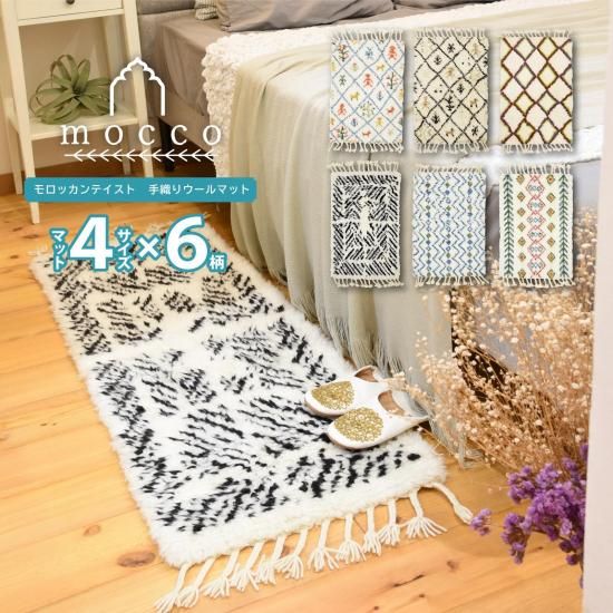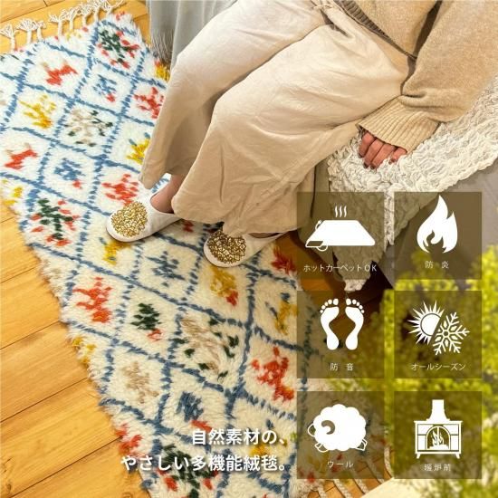 玄関やリビングなどのお部屋にアクセントを加えるのに最適です。素材には100%のパール部ウールを使用し、ウールの心地よさとモロッカンのかわいらしさが融合したアイテムです。