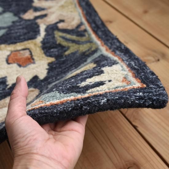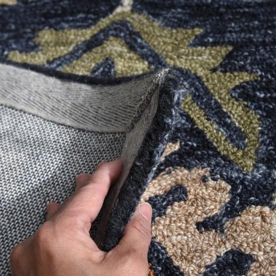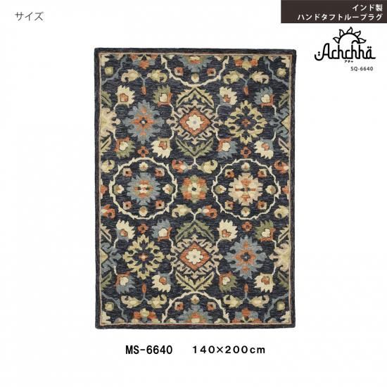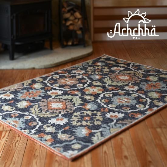 アチャは、インドで生産されたハンドタフトループラグです。品質とデザインにこだわったウール100%で作られ、パール部に綿布仕上げを施し、耐久性に優れています。