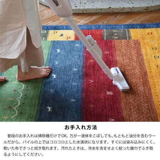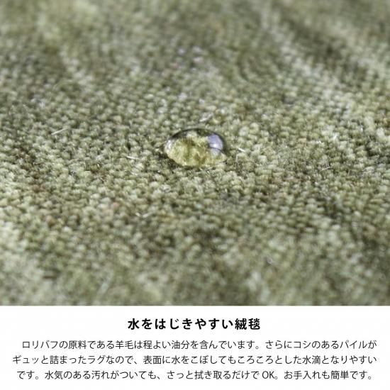 普段のお手入れは掃除機だけでOK。万が一液体をこぼしても、もともと油分を含むウールだから、パイルの上ではコロコロとした水滴状になります。すぐには染み込みにくく、乾いた布でさっと拭き取れます。汚れたときは、冷水を含ませよく絞った雑巾でふき取るようにしてください。