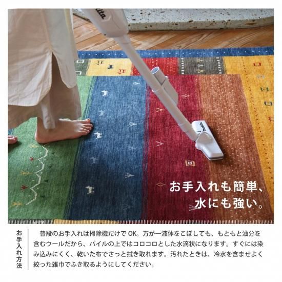 普段のお手入れは掃除機だけでOK。万が一液体をこぼしても、もともと油分を含むウールだから、パイルの上ではコロコロとした水滴状になります。すぐには染み込みにくく、乾いた布でさっと拭き取れます。汚れたときは、冷水を含ませよく絞った雑巾でふき取るようにしてください。