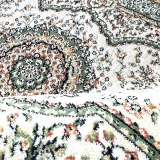 ペルシャ絨毯の伝統柄をベースに愛らしい草花やモチーフを配し、やさしい色合いで仕上げています。
