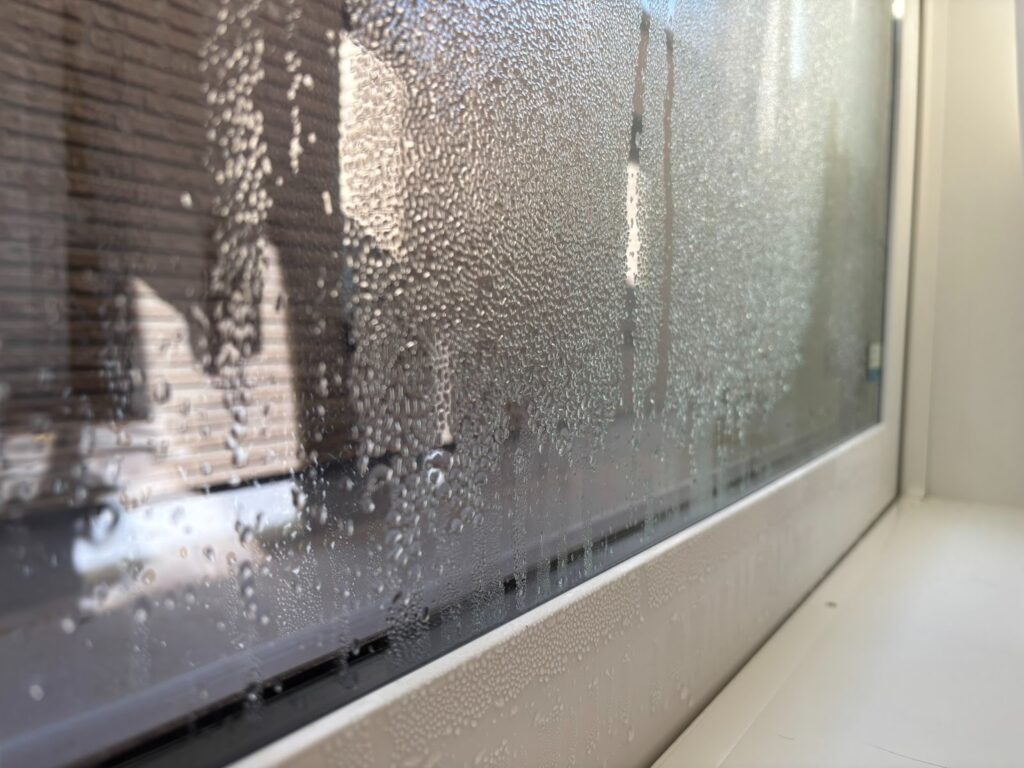 窓際は空気が滞留しやすく、特に雨の日や冬場の窓に発生する「結露」は湿気を生み出す原因と言えます。