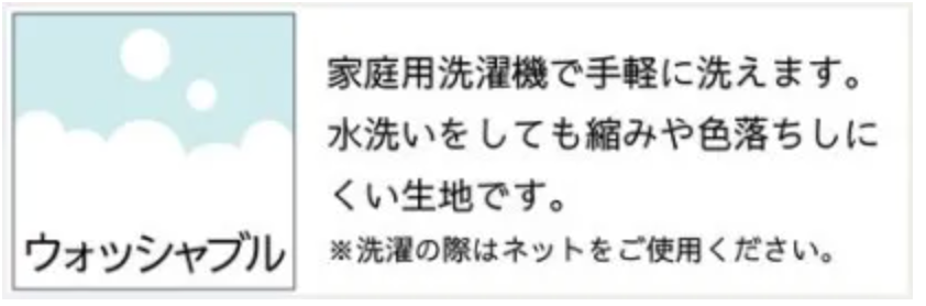 ウォッシャブル=家庭用洗濯機で手軽に洗うことができ、水洗いをしても縮みや色落ちがしにくい生地です。