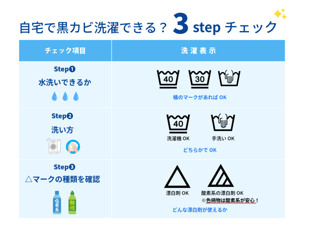 自宅で黒カビ除去ができるかどうかは、たった3つの洗濯表示を確認するだけで判断できます。