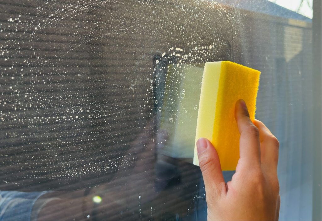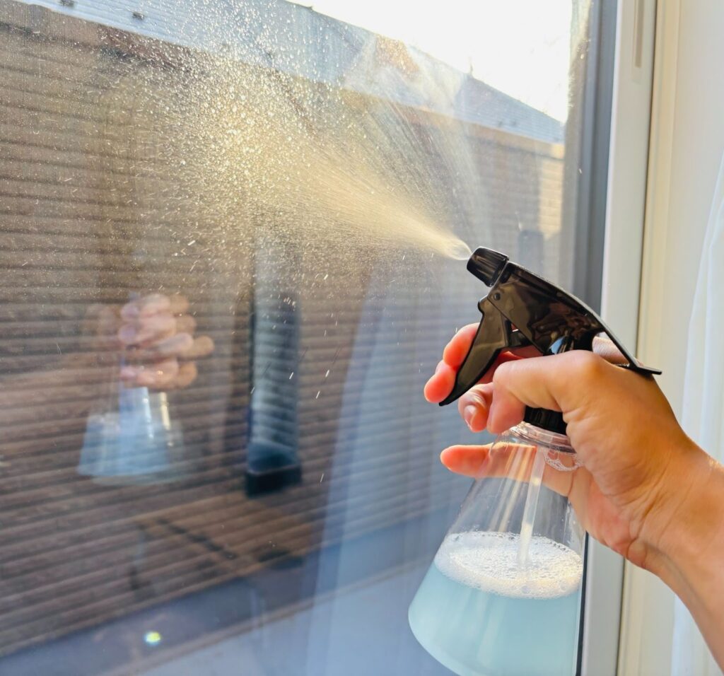 100均でも購入できる霧吹きなどに入れ窓に吹きかけ、スポンジで液体を塗り広げた後、