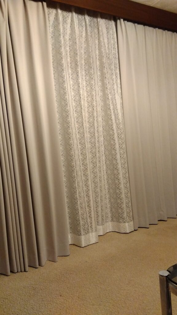 レースのカーテンは昨年購入した物、今回防寒に厚手のカーテンを購入。いい感じです。