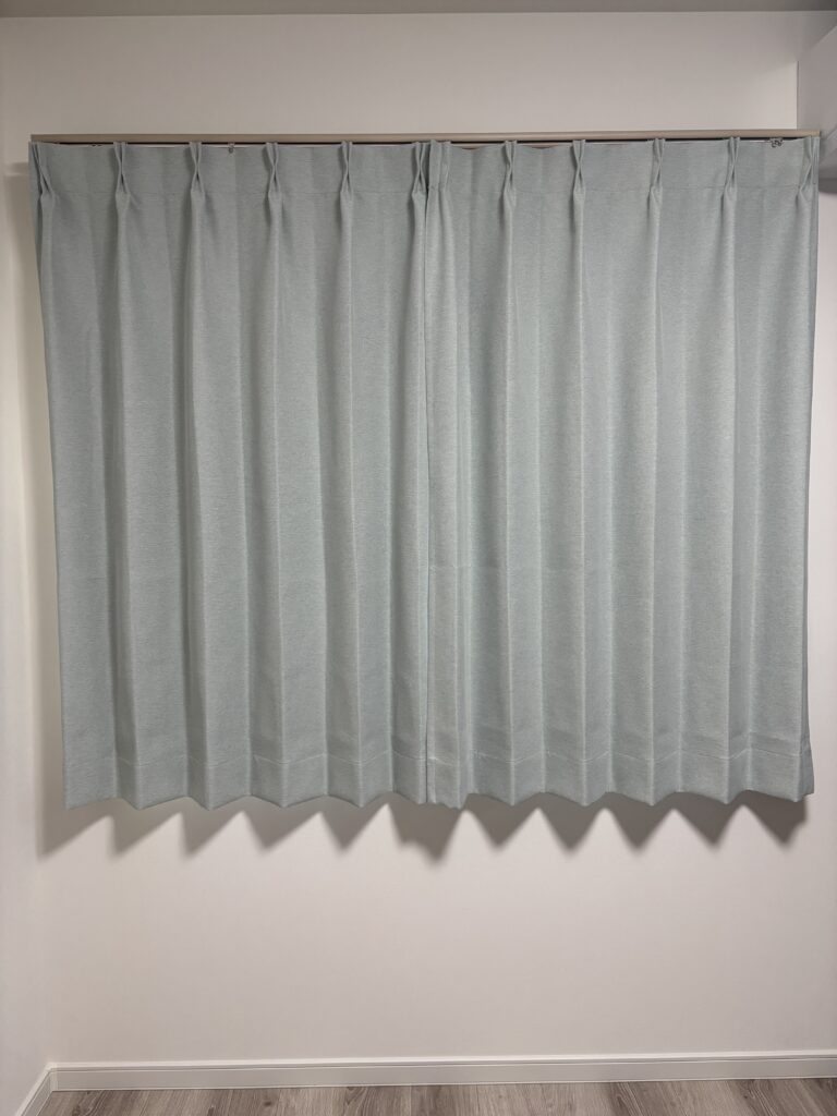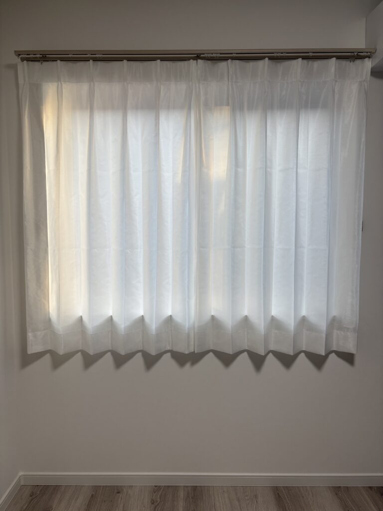 以前はニトリの既成カーテンをつけていたのですが、ヒダの作りなどが全く違うのですね…!